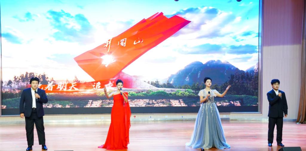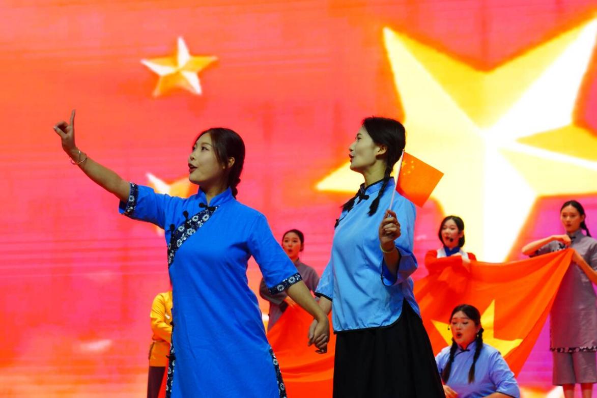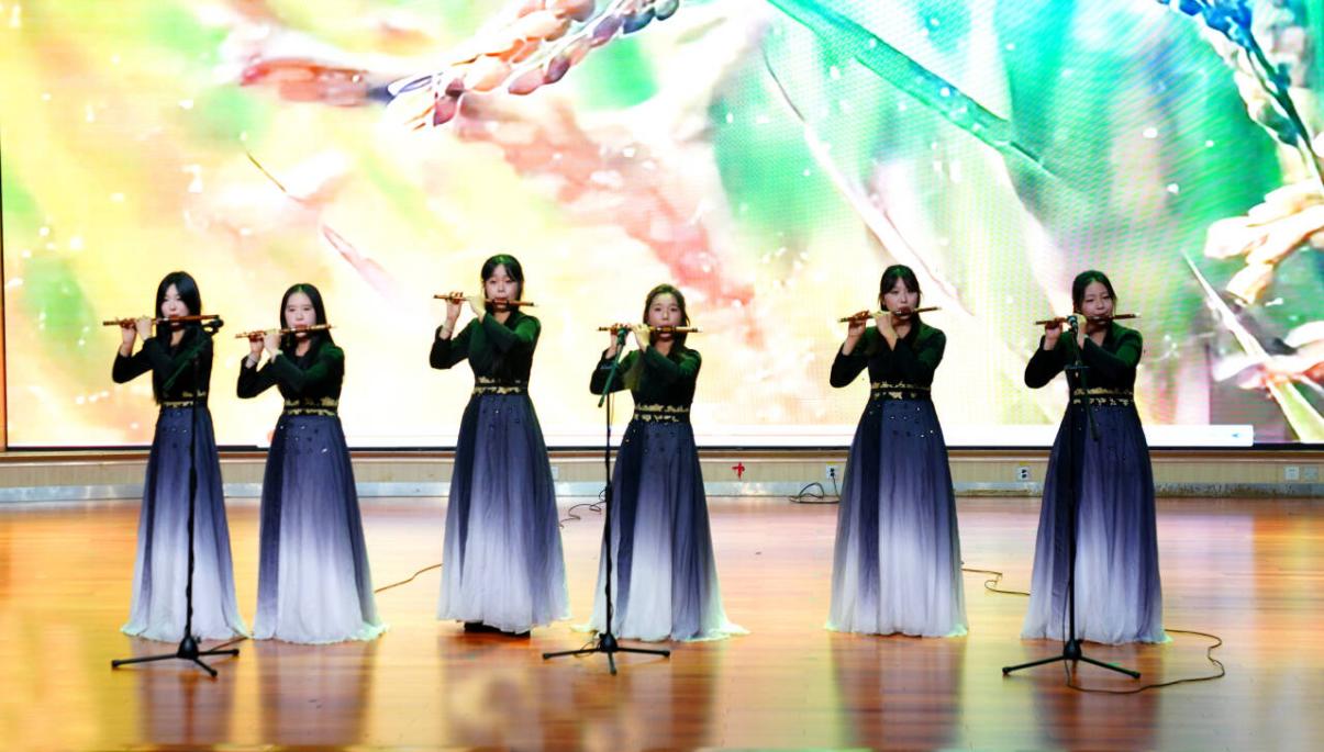 各类节目轮番登场、异彩纷呈,以多元艺术形式全面展现艺术学院的教学底蕴与学子风采。男女对唱《向往》以婉转歌声诉说对理想的执着追寻;舞蹈《四勇赞》用铿锵舞姿诠释担当精神的千钧重量;竹笛重奏《扬鞭催马运粮忙》则以欢快旋律绘就丰收时节的生动画卷;而由艺术学院退伍学子带来的军体拳《旗在,阵地在》,更以飒爽英姿演绎青春与责任的交响,将现场气氛推向高潮,掌声如潮。