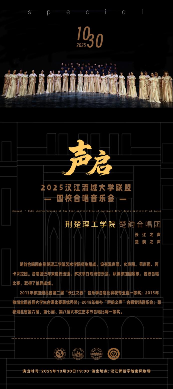 作为汉江流域大学联盟文化共享的重磅之作,本次音乐会由汉江师范学院、湖北工程学院、湖北文理学院、荆楚理工学院四校学子携声打造。他们将以合唱为媒,既有致敬传统的文化演绎,更有畅想未来的青春乐章,每一组和声都将穿透听觉边界,每一段旋律都将联结流域文脉。
