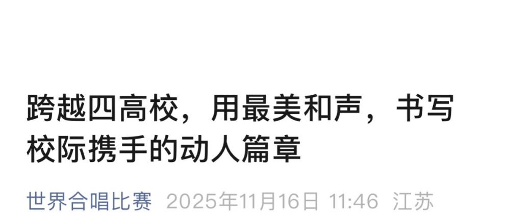 作为素有“合唱领域第一媒体平台”盛誉的国际赛事官方传播枢纽,“世界合唱比赛”公众号覆盖全球90%以上专业合唱团体。此次转载不仅是对活动专业水准的高度认可,更实现了区域性艺术活动影响力的能级跃升。其核心亮点在于四校突破校园边界的深度协作模式:通过联盟联动策划、协同创排演练、美育理念互通与教学实践交流,构建了“资源共享、优势互补”的艺术协作体系,形成了可复制的校际美育协同创新范式。平台对此模式的聚焦传播,实质向国际业界传递了“协同育人”的核心价值,为高校突破美育资源壁垒、提升艺术教育质量提供了实践参照,推动合唱教育从“单体发展”向“集群创新”转型。