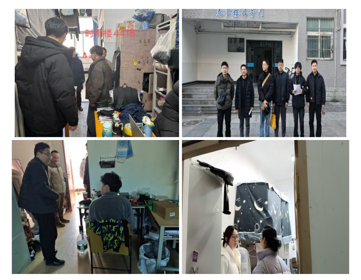 刘飞、崔蕾分别带队到修能楼、夏荷楼、时雨楼、清美楼、春雪楼的学生宿舍,检查宿舍用电安全、卫生等情况,了解留校学生的生活情况、离校时间,叮嘱在宿舍的同学们增强安全意识,合理安排假期生活,保持与辅导员的畅通联系。