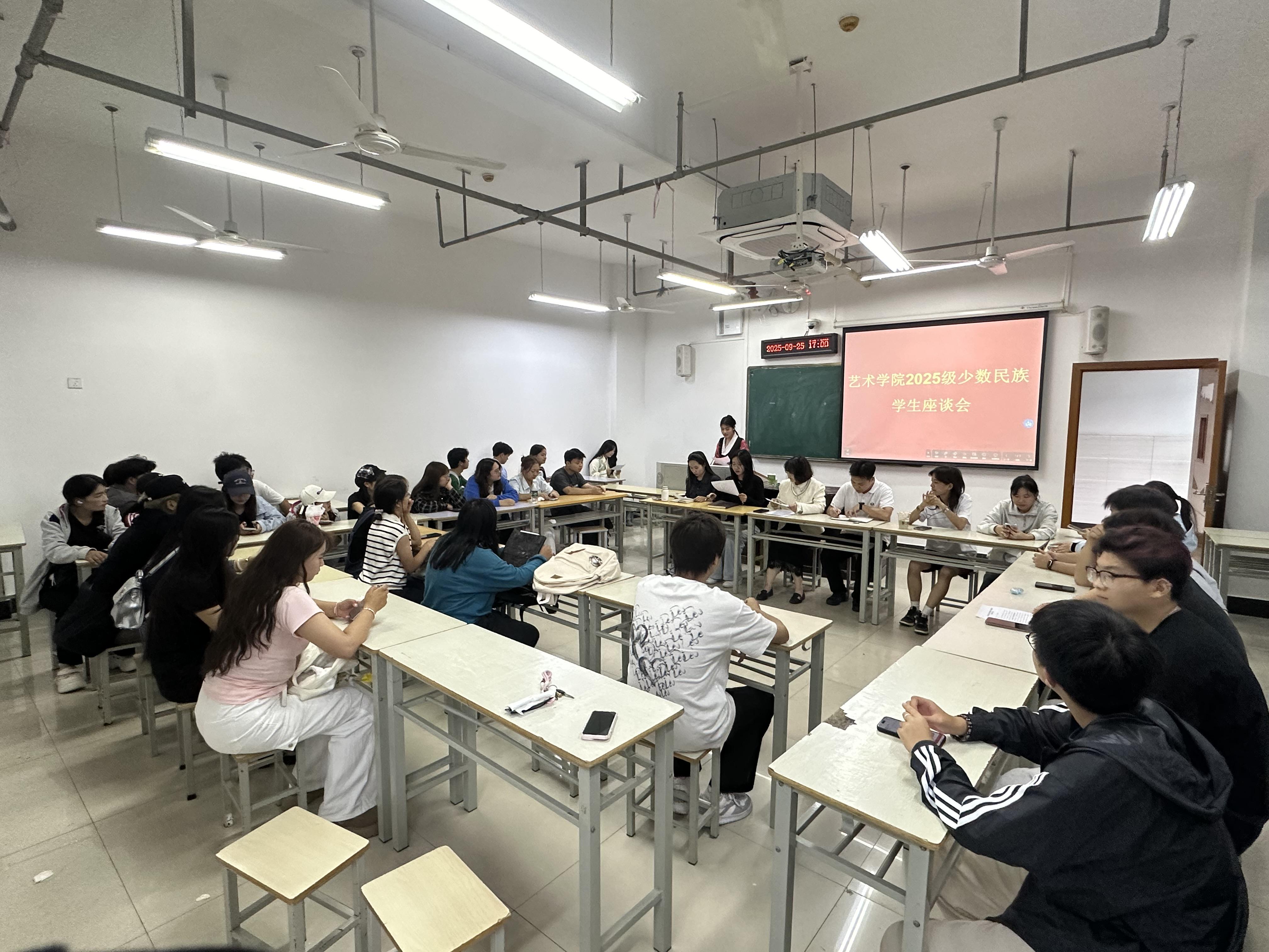 为帮助2025级少数民族新生更好地适应大学环境,及时了解并解决他们在学习与生活中遇到的困难,艺术学院于9月25日在尚艺楼组织召开少数民族学生座谈会。学院分党委副书记崔蕾、各年级辅导员、少数民族老生代表以及2025级全体少数民族新生参加座谈。